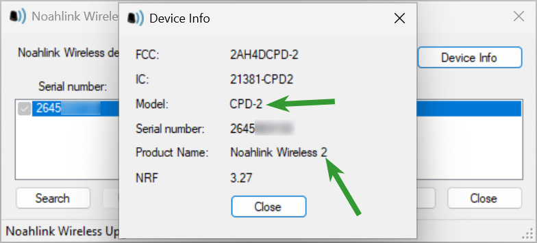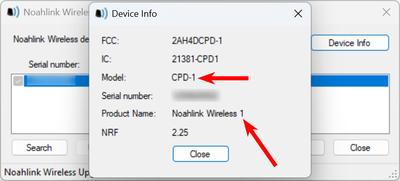 | Official Firmware Upgrader | ![]() Get the Official Firmware Upgrader through the link on this page. Running the firmware upgrader will display the firmware information for Noahlink Wireless 2, this is the firmware information for an authentic Noahlink Wireless 2. | ![]() The firmware information for a counterfeit Noahlink Wireless 2 will show that it is a Noahlink Wireless 1, with the model listed as CPD-1. |